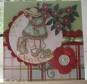 I used Fairy Flutterby Gracie and papers from All Around and Everywhere CD to make an easel card. I stamped the image twice to decoupage her and coloured with Copics. Punched borders and corner using Martha Stewart eyelet lace and flowers and leaves from stash. This card is also for the following challenge: